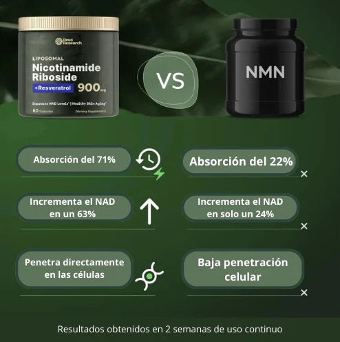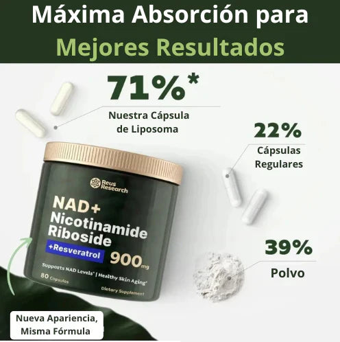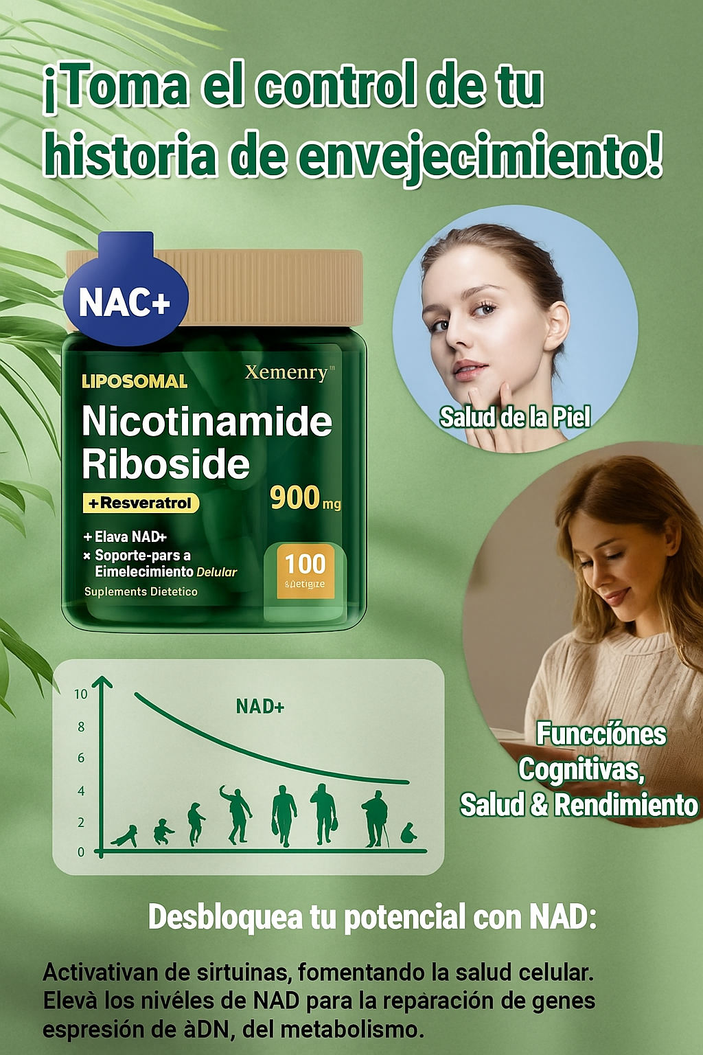✨ NAD+ Nicotinamide Riboside + Resveratrol 900mg es un suplemento premium diseñado para activar tu energía celular, mejorar la memoria y apoyar la longevidad. 🌿 Con una fórmula de alta biodisponibilidad, respalda la salud del corazón, la función cognitiva y protege tus células contra el envejecimiento prematuro.